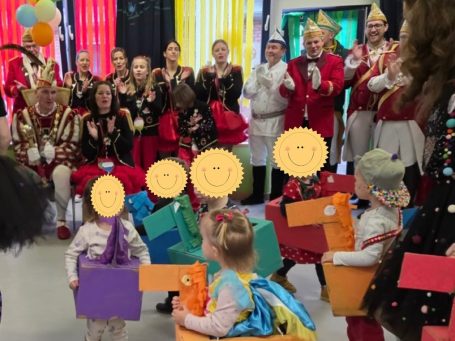 Nachdem die Reise durch Deutschland, Österreich, Italien und Spanien führte, wurde es Zeit, das große Karnevalsfest vorzubereiten. Wie in jedem Jahr freuten sich die “Kleinen Freunde” sehr darauf, den Prinzen mitsamt seinem großem Gefolge im Kindergarten begrüßen zu können. Prinz Basti I. und Prinzessin Anke zu Ehren präsentierten die Kinder ein buntes Programm. Die Hasenminis aus dem U3-Bereich flogen mit ihren selbstgebauten Flugzeugen “Ab in den Süden”, während eine weitere Gruppe sich mit einem großen Heißluftballon einen Platz in den Wolken suchte. Die “Kleine Freunde”-Band überraschte Prinz Basti mit einer besonderen Überraschung: Zu dessen großer Freude spielten sie das Lied “Der Junge mit der Mundharmonika”, weil sich auch im Kindergarten rumgesprochen hatte, dass der sehr musikalische Prinz selbst gerne zur Mundharmonika greift. Letztendlich stellten die Kinder fest, das “Dat Hätz vun dr Welt” Kölle und es zu Hause doch am schönsten ist.