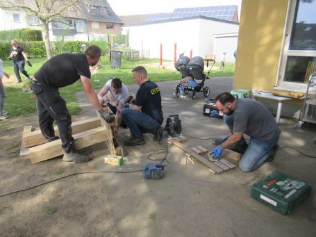 Mit viel Fantasie ging eine weitere Gruppe ans Werk. Es wurde gesägt, geschraubt und geschliffen und am Ende des Nachmittags entstanden aus alten Paletten eine Getränkebar für den Außenbereich sowie eine tolle Tankstelle, die schon bald zur Betankung der zahlreichen Kinderfahrzeuge zur Verfügung stehen wird.